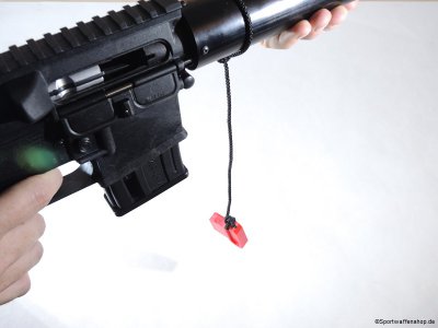 Der Sicherheitsstecker eliminiert diese Sicherheitslücke. Er wird nach dem letzten Schuss in den offenen Verschluss eingesetzt. Dann kann das leere Magazin entnommmen werden. Der Stecker ist so bemessen, dass nach einem Magazinwechsel und Entfernen des Steckers automatisch die erste Patrone des neuen Magazins geladen wird. So erübrigt sich der Griff an den Nachladehebel.
